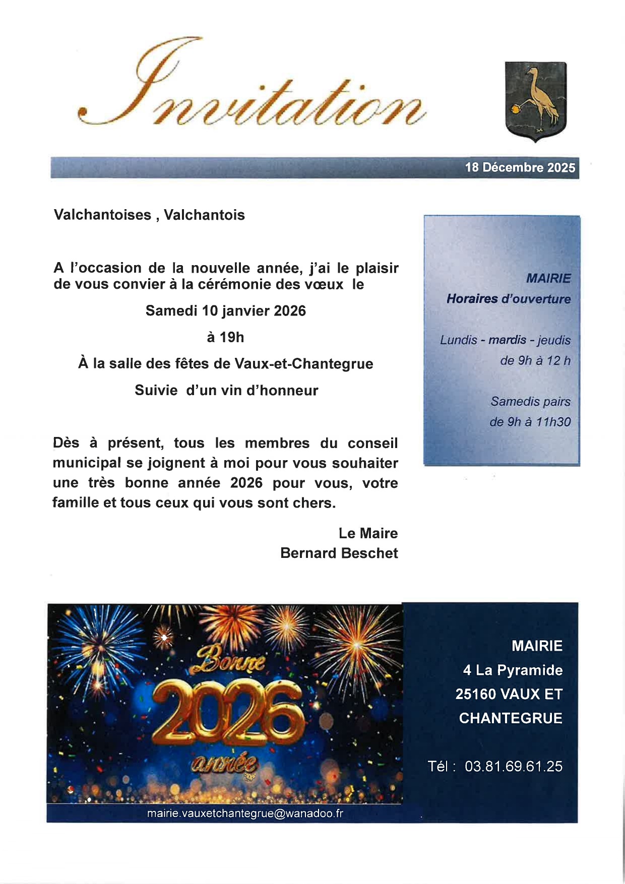 Vous êtes ici : Accueil > INVITATION AUX VOEUX DU MAIRE LE SAMEDI 10 JANVIER 2026 19H00