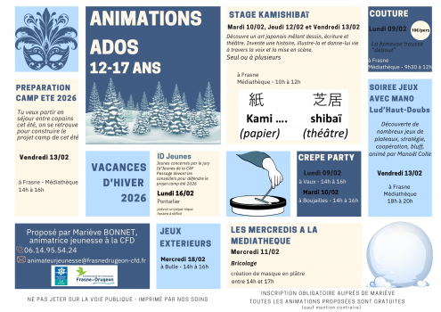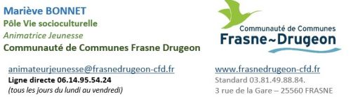 Inscription obligatoire auprès de Mariève animatrice jeunesse : Contact : 06.14.95.54.24 animateurjeunesse@frasnedrugeon-cfd.fr